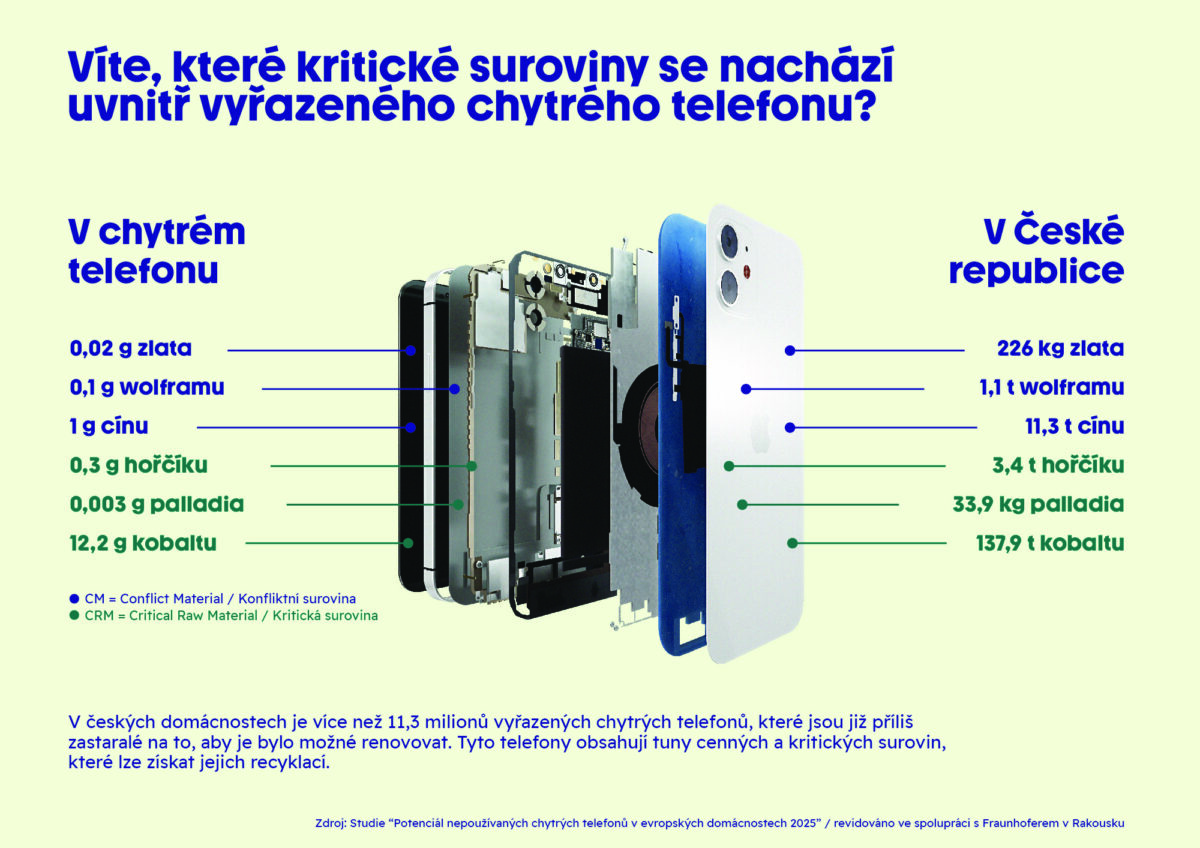 Podle studie by čeští majitelé 11,3 milionu zařízení mohli jejich jednoduchým odevzdáním k recyklaci výrazně přispět k naplnění recyklačních cílů EU. Přestože jeden telefon obsahuje jen několik gramů kovů, v součtu jde o mimořádné množství surovin, připravených k opětovnému využití. V České republice tak v těchto zařízeních leží materiál v hodnotě více než 27,6 milionu eur.
